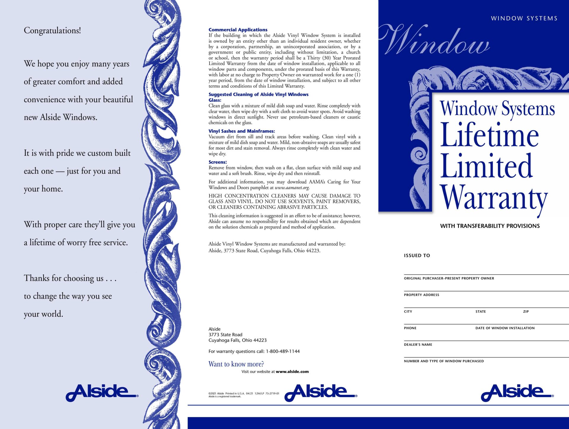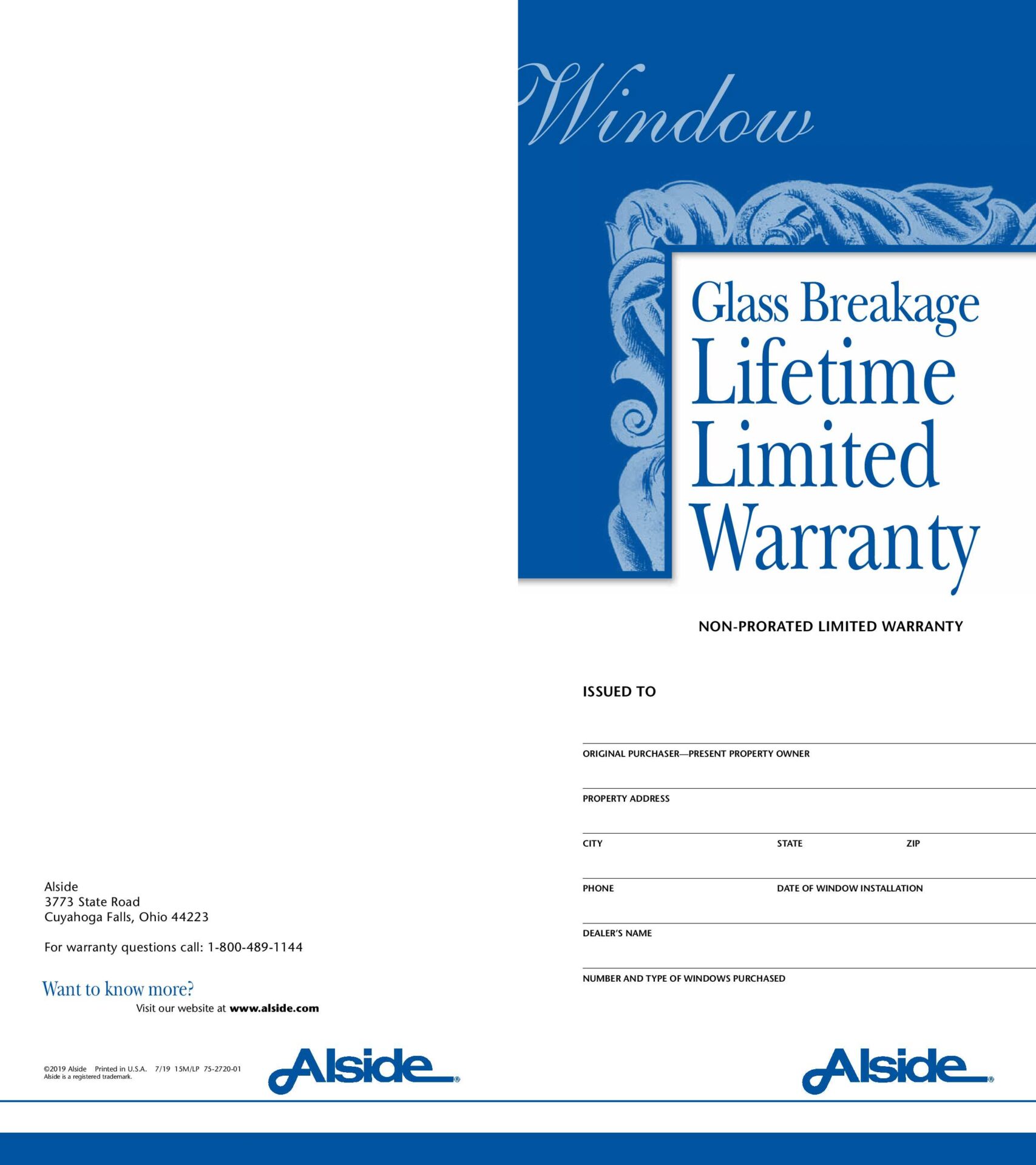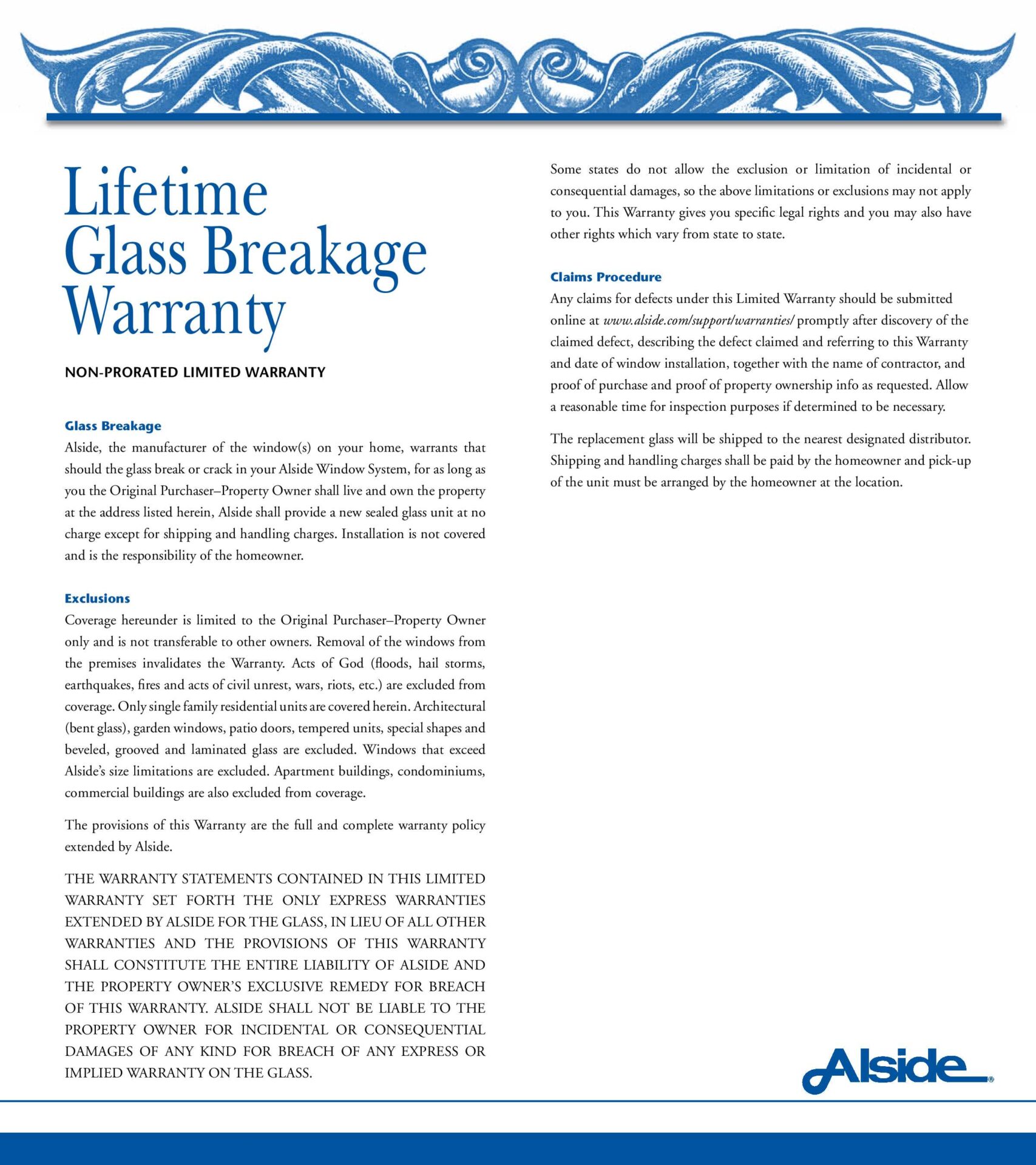 Glass Breakage Alside, the manufacturer of the window(s) on your home, warrants that should the glass break or crack in your Alside Window System, for as long as you the Original Purchaser–Property Owner shall live and own the property at the address listed herein, Alside shall provide a new sealed glass unit at no charge except for shipping and handling charges. Installation is not covered and is the responsibility of the homeowner.