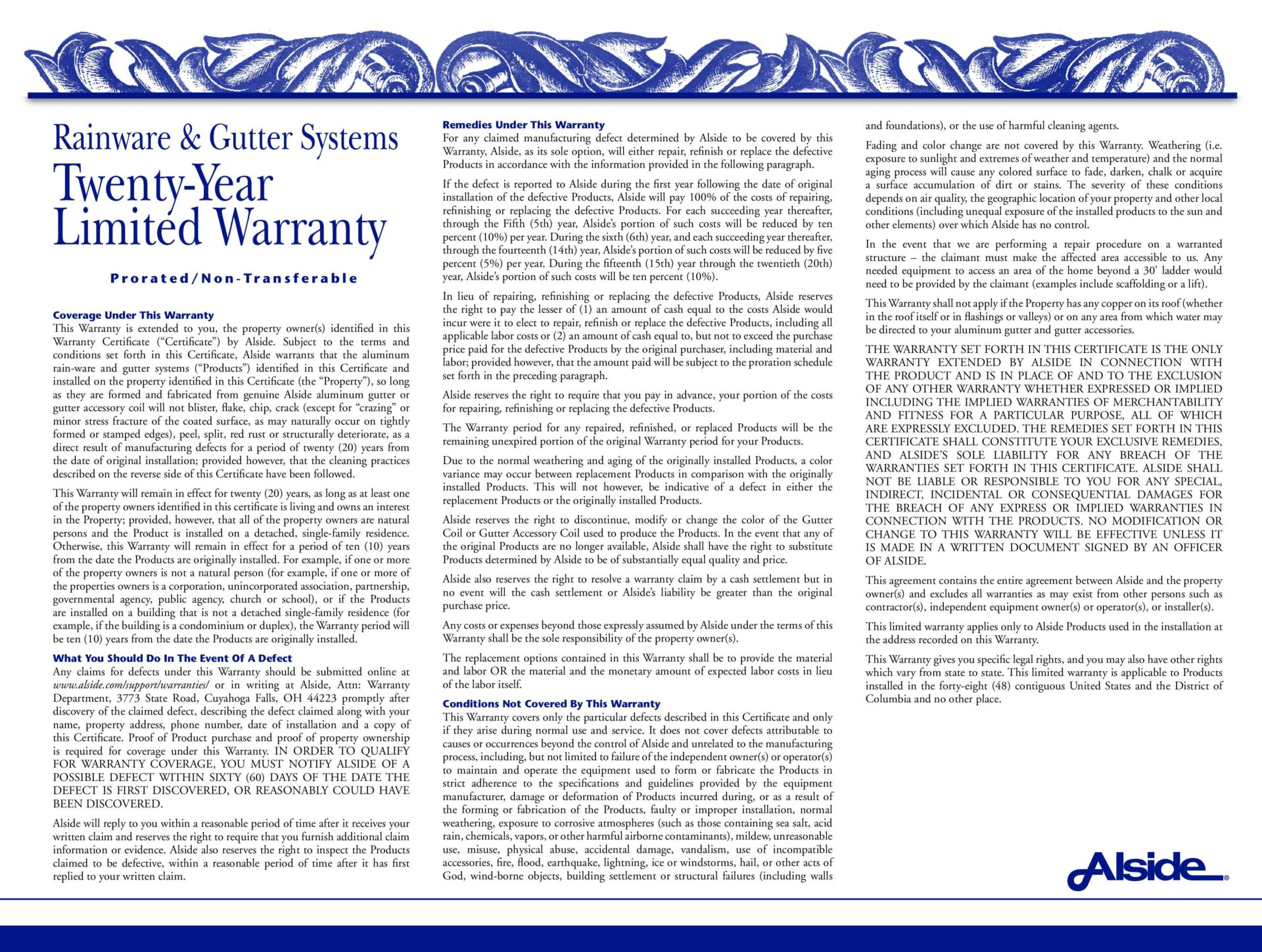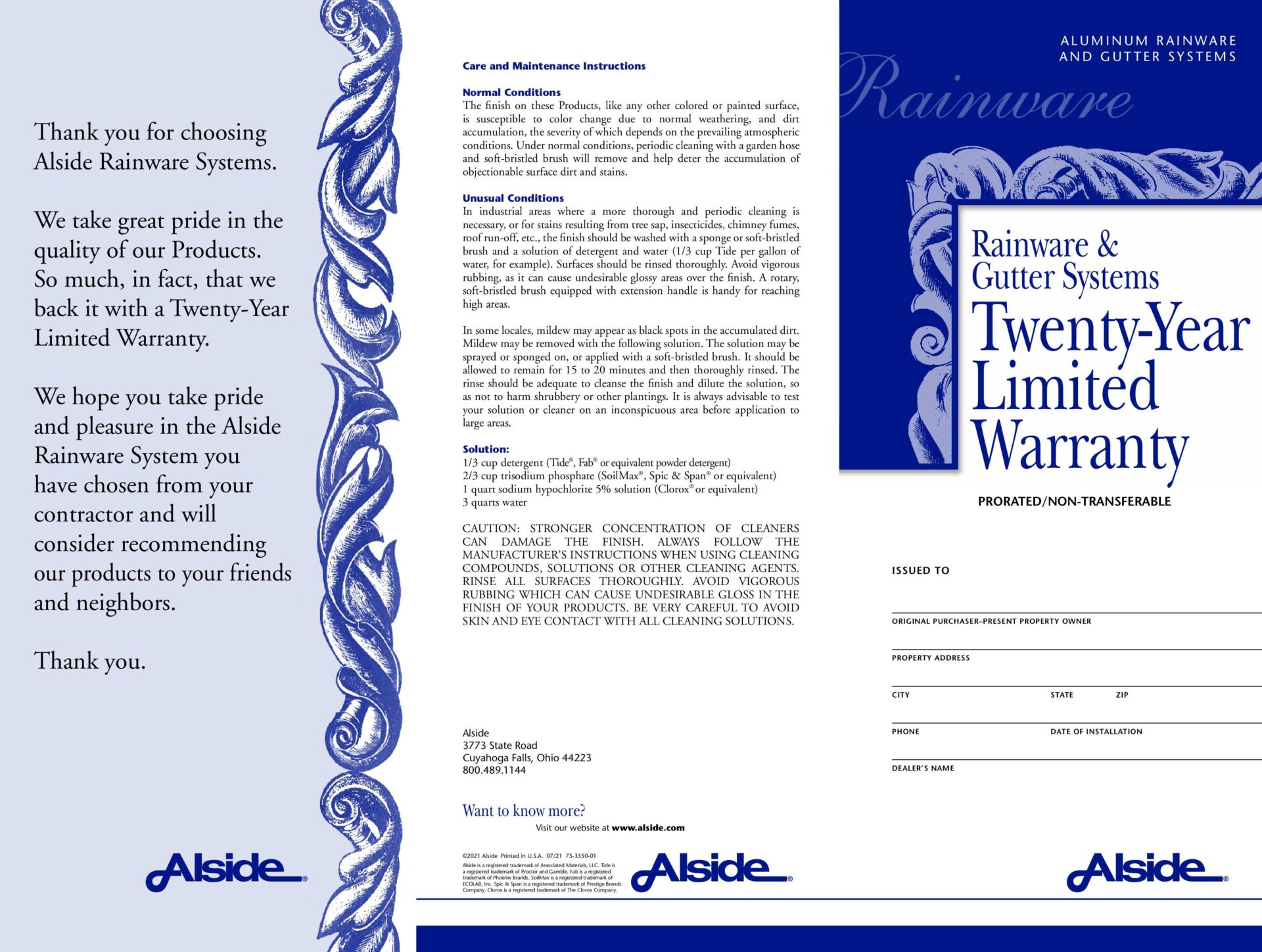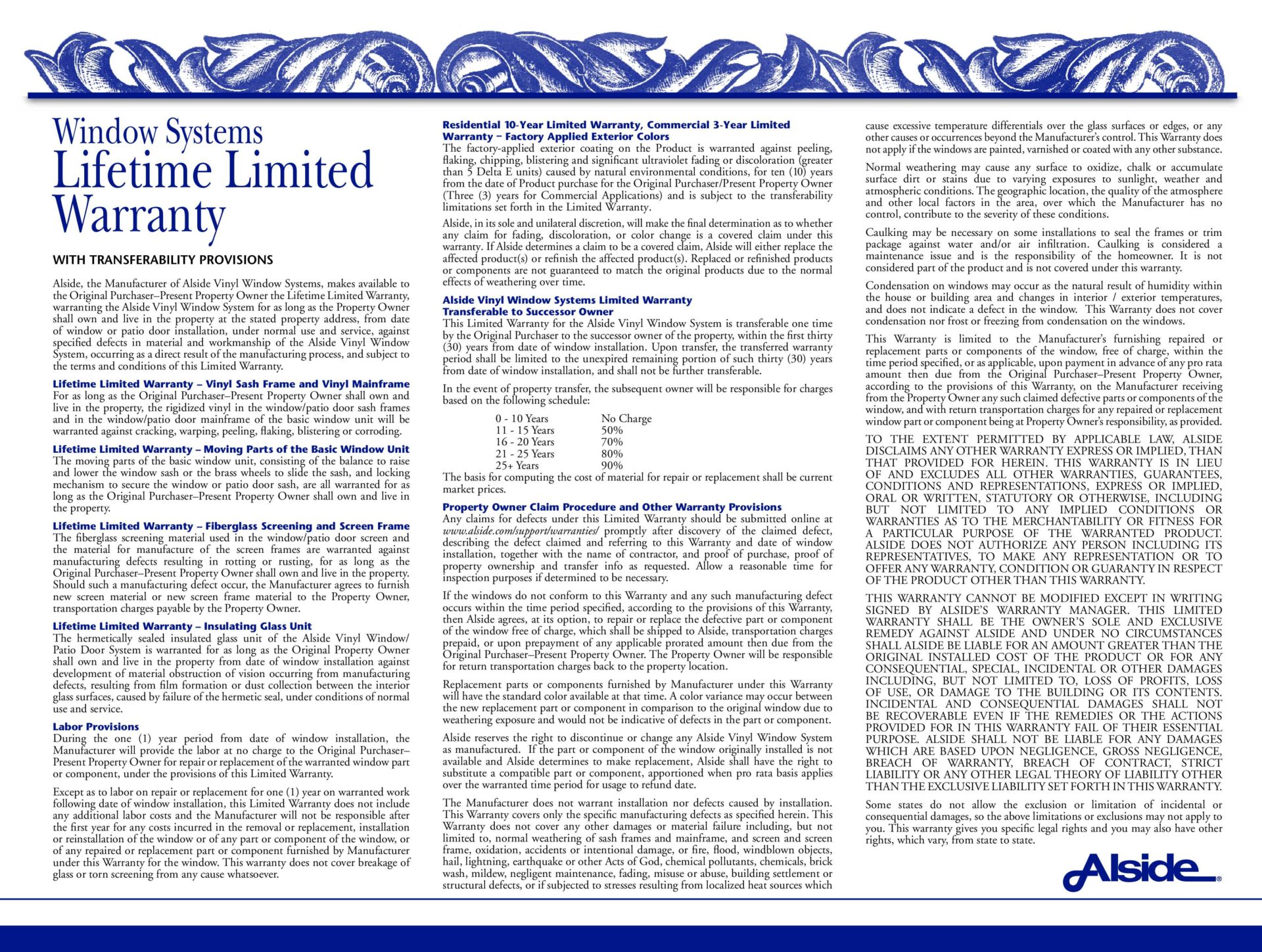 Glass Breakage Alside, the manufacturer of the window(s) on your home, warrants that should the glass break or crack in your Alside Window System, for as long as you the Original Purchaser–Property Owner shall live and own the property at the address listed herein, Alside shall provide a new sealed glass unit at no charge except for shipping and handling charges. Installation is not covered and is the responsibility of the homeowner.